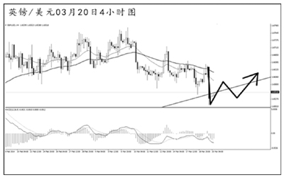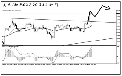 美元兌瑞郎短線發起強勁反彈。4小時圖MACD多頭動能充盈,目前需重點關注下降趨勢線的阻力位0.8850一線,若能升破此位置,匯價還將展開更為強勁的上攻。