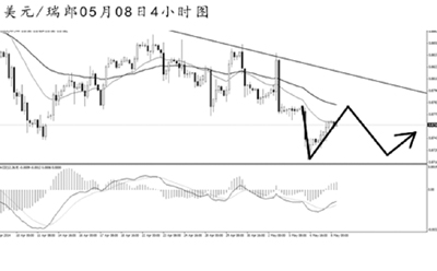 美元兌瑞郎4小時圖強動能交替節奏頻繁,但下跌趨勢不變。短線匯價有一定的上行需求,但想直接升破趨勢線阻力的概率不大,預計后市仍將以震蕩走弱的節奏運行。