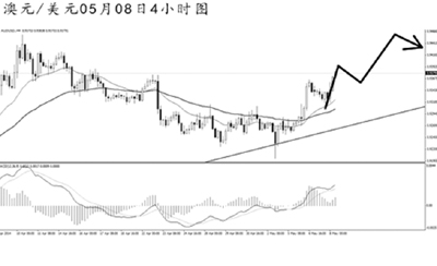 美元兌加元短線暴發出強勁的空頭動能。4小時圖均線系統已經形成了向下的排列,MACD顯示空頭動能充盈。預計匯價將繼續以下行為主,有望向1.0560的趨勢線支撐一帶發起挑戰。目前仍需謹慎看空。