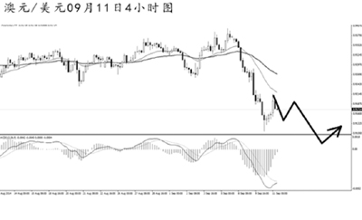 澳元兌美元短線下跌的力度無比強勁,均線系統(tǒng)重新形成空頭排列,MACD顯示下跌動能占據(jù)明顯的優(yōu)勢。短線匯價發(fā)生了一定程度的反彈,但并沒有改變整體的下跌趨勢,目前可關注道氏高點0.9215,只要此點位不被升破,澳元仍有繼續(xù)下行的動力。