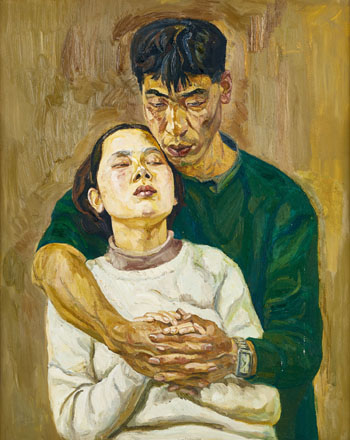 九十年代初,劉小東創作了一系列以身邊朋友為模特兒的「愛情」題材作品,真實地記錄了八十年代末到九十年代初情人們熱戀的心理歷程,以及中國社會和文化在轉型時期的豐富性。1991年作的《纏綿》是這階段的代表作之一。整幅畫面的構圖被一對擁抱在一起的戀人占據,沒有多余的情節與縫隙。徹底脫離了宏大敘事的劉小東,癡迷地表述普通人的真實,個體的價值在他的繪畫中被大大提升。