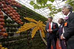 山東壽光是我國北方著名的“菜籃子”,目前全市優質蔬菜基地已達80萬畝,年產優質蔬菜40億公斤。在中國壽光國際蔬菜科技博覽會會上,三位外國參展商被用果蔬制成的藝術造型吸引。(本報資料照片) |