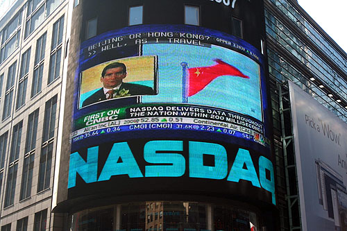 中國(guó)企業(yè)赴美上市的門(mén)票易得,但在適應(yīng)美國(guó)法律制度和理念上,還有待提高。圖為2007年4月3日,美國(guó)紐約時(shí)報(bào)廣場(chǎng)的納斯達(dá)克大型電視屏幕,納斯達(dá)克股票交易所在中國(guó)北京“遙控”敲鐘開(kāi)市。資料照片 |