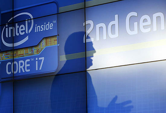 | 1月5日,在美國拉斯韋加斯國際消費電子展的英特爾新聞發布會上,英特爾總裁保羅·奧特里尼的身影投射到墻上。新華社/路透 |