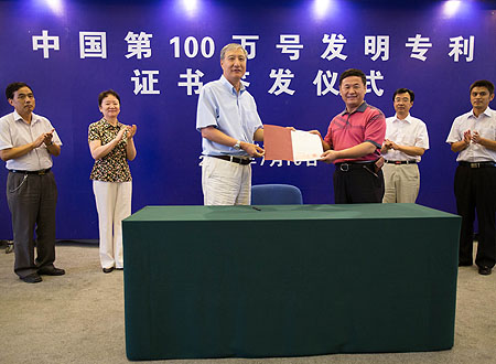 7月16日,國家知識產權局局長田力普(左三)向發明專利權利人北京農業信息技術研究中心的負責人頒發證書。此次簽發的第100萬號授權發明專利名稱為“一種虛擬玉米葉片模型可控面元劃分方法”。自1985年授權首件發明專利以來,至今年7月11日,我國27年時間里發明專利累計授權量達到100萬件,成為世界上達到這個目標耗時最短的國家。但是,我們的專利擁有總量、國民人均擁有量、專利轉化率,還遠遠落后于許多領先的創新性國家。記者 金立旺 攝 |