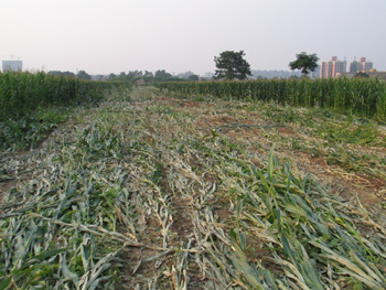 科收來臨之際,西安市郭杜鎮郭南村的數百畝玉米田日前遭到不明大型車輛“橫沖直撞”,百余畝即將成熟的玉米被碾毀。郭杜鎮因毗鄰某開發區,近年來因農村土地征用問題引發糾紛。本報記者馮國