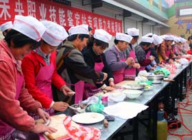 11月21日,農民選手們在參加“水餃制作”比賽。當日,由西安市勞動局舉辦的“農民技能大比武”在未央區八興灘村舉行,來自40多個村、經過一個月免費培訓的230多名農民選手,參加了“手工編織”“鍋貼制作”“水餃制作”“手工面制作”等項目的比賽。