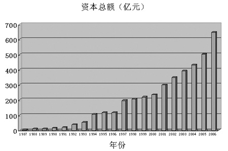 2006年底,全國財務公司資本總額為647億元,較1987年的2億元增長了323倍。(見圖二)
