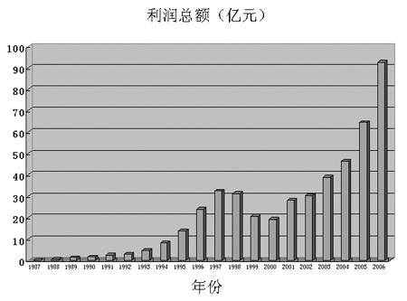 2006年,全國財務公司實現利潤總額93億元,較1987年的341萬元增長了2300倍。(見圖三)