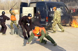 11月21日,參加反搶劫演練的保安與企圖搶劫押運車的“犯罪分子”搏斗。