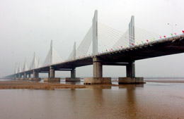 11月28日,大(慶)廣(州)高速公路河南段標(biāo)志性建筑——開封黃河大橋建成通車。 開封黃河大橋于2004年9月開工建設(shè),總投資約20億元,全長7.8公里,主橋長1010米,橋?qū)?7.4米。圖為建成通車的開封黃河大橋。