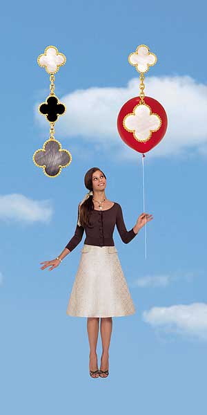 用金褐色的虎眼石作成蝴蝶;以深綠色的孔雀石作成葉子……蝴蝶、葉子、心形和星形成為了Lucky系列中四個全新的主題圖案。該系列采用了散發幸運色彩的寶石,以黃金或白金滾邊鑲嵌,展現出了與以往幸運草系列截然不同的風格與形態。