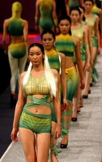 黑色高領的上裝,白底細黑邊組成雙腰的短褲,微微露臍,加上美麗的腰帶,凸顯了模特兒高挑傲人的身段,黑白兩色相間別具一格,表現了時尚動感的一面。天藍色的內衣也別具匠心,將抹胸與短褲用細細背帶連接起來簡單地系在脖頸上,且在背帶上點綴了一些藍綠色的裝飾花,使女性看起來嫵媚脫俗,清麗動人。帶有中國傳統特色的紅色系的內衣一出場就吸引了觀眾的眼球,紅色的頸帶在同色的抹胸前交叉,后又輕松地系于頸后,紅白相間的雙腰短褲美觀大方,使整套內衣顯得簡單又具有濃郁的民族特色。 |
