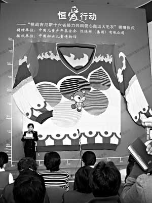 3月27日,在北京2008年奧運會開幕式倒計時500天之際,由恒源祥(集團)有限公司和中國兒童少年基金會聯(lián)合主辦的“恒愛心奧運情——挑戰(zhàn)吉尼斯16省接力共編愛心大毛衣”活動在全國婦聯(lián)大樓舉行了捐贈儀式,與會者見證了世界最大純手工編織羊毛衫的誕生。