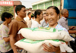 8月14日,四川省華鎣市永興鎮的災民領取社會各界捐助的賑災物資。當日,由社會各界捐助的賑災物資運送到華鎣市永興鎮,并發放到災民手中。今年7月,華鎣山區遭受山洪和泥石流襲擊,公路被毀,田地、房屋被淹,群眾生產生活一度陷入困境。