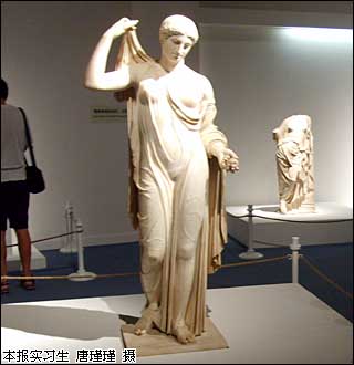 初秋的北京,午后的陽光依然灼熱,長安街一如往常的車水馬龍,在繁華喧囂的街市旁卻有一處能夠讓心靈沉靜下來的空間。首都博物館外,印有巨幅維納斯雕像的海報吸引著人們走入古典希臘藝術的殿堂,主題為“古典希臘藝術”的盧浮宮珍藏展正在這里舉行。 步入首都博物館1400平方米的臨時展廳,四根形似帕特農神廟的石柱高高矗立在記者面前,在燈光照射下,帶有黃土一般色彩的柱子散發著神秘氣息,好似一道穿越時光的大門,邀請人們踏上一場古希臘文化之旅。