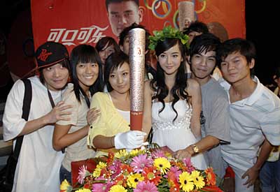 10月24日,火炬手韓燕(右三)與觀眾合影。當(dāng)日,可口可樂奧運(yùn)火炬手海南地區(qū)選拔活動(dòng)落下帷幕,共選拔產(chǎn)生了10名火炬手。