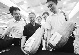 圖為岳龍芳(左二)抱著22斤重的“蜜本南瓜王”熱情地向參加推介會的群眾介紹無公害蜜本南瓜的優點。