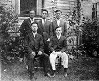 中國科學社第一屆董事會主要成員合影(民國四年十月二十五日),后排左起為秉志、任鴻雋、胡明復,前排左起趙云任、周仁。 |