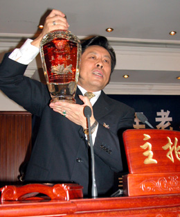 2004年7月一瓶釀?dòng)?00年前的五糧液以50萬(wàn)元被拍賣。新華社記者:周俏春 攝
