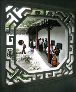10月4日,在蘇州古典園林獅子林,游客從造型別致的花窗旁經過。新華社發(杭興微