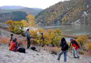 10月4日,旅游者在內蒙古克什克騰世界地質公園內的西拉沐倫大峽谷拍攝疏林秋色。新華社記者:張領