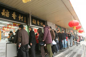 每逢元宵、端午和中秋,許多老北京都講究到稻香村買上點兒元宵、粽子或月餅,而稻香村門店前蜿蜒排起的長龍也是京城節日一景。雖然是北京的百年老號,稻香村主營的卻是南味食品,而且在競爭激烈的京城食界“百年不老”,個中緣由頗耐人尋味。