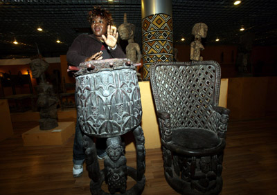 11月24日,由中非文化交流中心和北京橋藝術(shù)中心聯(lián)合主辦的“原始藝術(shù)與現(xiàn)代生活——非洲藝術(shù)精品展”在北京開箱布展。圖為一位非洲藝術(shù)家在介紹非洲近200年的巴姆雷克族酋長王座和非洲酋長禮器鼓。