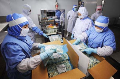 山東諸城外貿(mào)集團的員工在包裝出口到荷蘭的熟制雞肉產(chǎn)品。近日,山東九家企業(yè)已恢復(fù)對歐盟國家出口熟制禽肉產(chǎn)品,這標志著時隔六年后中國熟制禽肉產(chǎn)品開始重返歐盟市場。2002年,歐盟以進口中國部分動物源性食品未達到其要求為由,全面禁止從中國進口動物源性產(chǎn)品。經(jīng)國家和山東有關(guān)部門長期努力,歐盟委員會終于在前不久通過決議,批準歐盟成員國恢復(fù)山東九家企業(yè)的熟制禽肉制品。