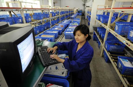 江西新華發行集團圖書配送部的圖書主動配送流水線。