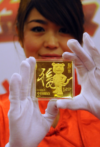 1月5日,禮儀小姐正在展示《庚寅年》郵票金磚。