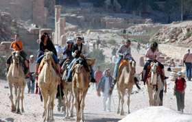 10月26日,在距約旦首都安曼約260公里的旅游名勝佩特拉,游人興致勃勃地騎著駱駝游覽。為讓游客體驗古羅馬時期的風情,佩特拉景區為游客提供了馬車、駱駝、毛驢等作為代步工具。