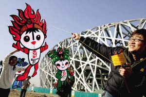 昨天(1日),工作人員在“鳥巢”(國家體育場)放飛福娃造型的大風箏,為即將在正月初二和初三上演的奇幻童話劇《福娃》“造勢”。當天,《福娃》的近百張門票贈給“鳥巢”施工工人的子女,讓他們也能感受到奧運文化。