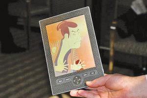 日本廠商富士通日前在2007北美技術年會上推出了彩色電子紙(e-paper ),其分辨率為640×480的8英寸版本厚度僅0.03毫米,12英寸版本也在開發計劃中,最大尺寸據稱將達到2.5米。