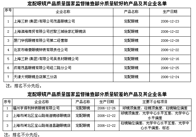 為維護消費者的合法權益,促進定配眼鏡行業健康發展,國家質檢總局組織對定配眼鏡產品質量進行了國家監督抽查。共抽查了北京、天津、上海、江蘇、河南、福建、山東等7個省、直轄市99家生產企業的99種產品,產品抽樣合格率為86.9%。自2000年起已連續8次對定配眼鏡產品質量進行了跟蹤抽查,促進了產品質量的不斷提高。