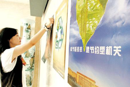 圖為國家質檢總局工作人員正在張貼節能宣傳周橫幅。