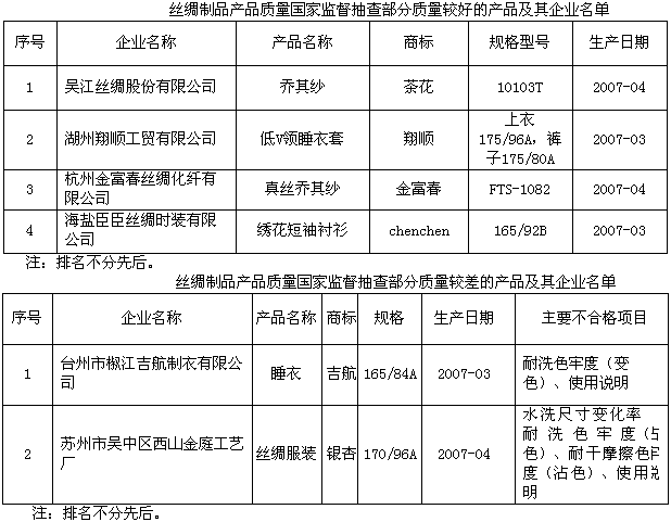 為維護(hù)消費(fèi)者的合法權(quán)益,促進(jìn)絲綢行業(yè)健康發(fā)展,國(guó)家質(zhì)檢總局組織對(duì)絲綢制品產(chǎn)品質(zhì)量進(jìn)行了國(guó)家監(jiān)督抽查。共抽查了絲綢制品主產(chǎn)地浙江、江蘇、上海、廣東等4個(gè)省、直轄市49家企業(yè)生產(chǎn)的49種產(chǎn)品(不涉及出口),產(chǎn)品抽樣合格率為75.5%。