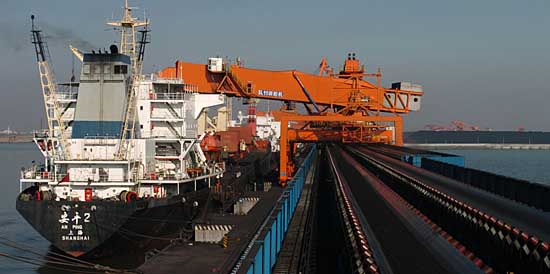 一艘輪船停泊在秦皇島港煤碼頭裝貨。本報記者 楊世堯