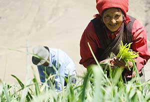 | 西藏山南地區乃東縣的農民喜收蒜苔,當地政府進行農業結構調整取得明顯成果。 | 在湍急水流的沖擊下,西藏白朗縣貴熱村的廠房里的四臺水磨發出了隆隆的轟鳴聲,旋舞的磨盤下,細密的糌粑向雪花一樣落入收集槽里。已經在這個名為康桑農產品加工廠里工作兩年多的達娃頓珠說:“一個磨盤一天一夜可以磨一千斤糌粑,產品銷路非常好,除了拉薩、日喀則,還賣到了尼泊爾。” 眼下,像康桑這樣的特色農產品加工企業正在西藏不少地區蓬勃興起,成為當地農村、農業經濟增長的新亮點。西藏自治區人大常委會副主任洛桑頓珠說,充分利用生態條件,將環保和經濟發展相結合,是雪域高原特色農業發展的必經之路。