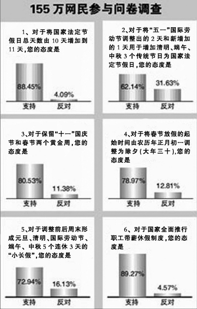 中立意見:馬小姐(超市員工) 其實,放假調整對我們來說意義并不大,越是節(jié)假日越忙,各種促銷活動特別多,客流也是平時的好幾倍。按規(guī)定,我們規(guī)定節(jié)假日是不能休息的,上班也都是倒著上的。在超市工作3年,我還沒在黃金周休息過,更別提出去玩了,幸虧假日上班有補貼。 據(jù)統(tǒng)計,從9日上午至12日12時,已有近185萬網民參加國家法定節(jié)假日調整草案民意調查,各界反響強烈。目前,調查時間已經過半,結果顯示八成網民支持法定節(jié)假日調整方案。從最新投票結果看,法定節(jié)假日總天數(shù)由10天增加到11天的支持率為88%,調整“五一”并增加3個傳統(tǒng)節(jié)日為法定假日的支持率為67%,保留“十一”國慶節(jié)和春節(jié)兩個黃金周的支持率為81%,將春節(jié)放假時間提前到除夕的支持率為81%,將元旦、“五一”及3個新增法定假日與前后周末調整成連續(xù)3天“小長假”的支持率為76%,全面推行職工帶薪休假制度的支持率為90%。 “這次國家對法定節(jié)假日進行調整,最大的亮點就是民眾成為政府決策的‘參謀者’。廣泛征求民眾意見,體現(xiàn)的就是黨和政府以人為本、重視民意的執(zhí)政理念。”天津市社科院教授王來華認為,新休假方案只要符合大部分人意愿,更好地保障勞動者的休息權,讓公民休假權落到實處,相信人民會接受并給予支持。