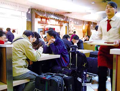 近日,首都機場航站樓內(nèi)部分餐飲店開始降價,單品最高降價達(dá)33%。預(yù)計到11月30日,共248種食品將和市內(nèi)同質(zhì)同價。圖為機場航站樓地下一層中華美食城餐廳一角。