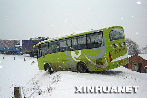 1月27日,一輛載客大客車由江蘇駛往安徽廬江,繞道行至巢湖市無為縣裕新路一彎道時,因路面積雪濕滑,車輛失控險些栽進裕溪河,聞訊趕到的交警立即組織施救并將乘客安全轉運。1月26日,安徽省巢湖市出現暴雪天氣,給人們出行帶來很大不便,道路交通受到影響。巢湖市氣象臺發布了暴雪和道路結冰橙色預警。 新華社發