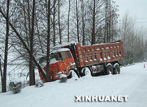 1月26日,一輛大貨車在合巢路巢湖廟集收費站附近因路滑失控栽到路邊。新華社發