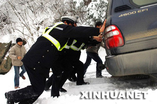 1月24日,安徽省岳西縣幾位民警在推陷入積雪的汽車。近日,位于大別山區的安徽省岳西縣出現有歷史記錄以來最大降雪,造成全縣道路中斷。大雪過后,該縣縣直機關、各鄉鎮、村積極行動起來,開展除雪工作,盡全力保證道路暢通。 新華社記者 李健 攝
