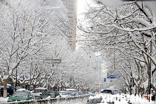 | 1月28日,南京街頭的樹木上積滿白雪。 新華社記者 孫參 攝 |