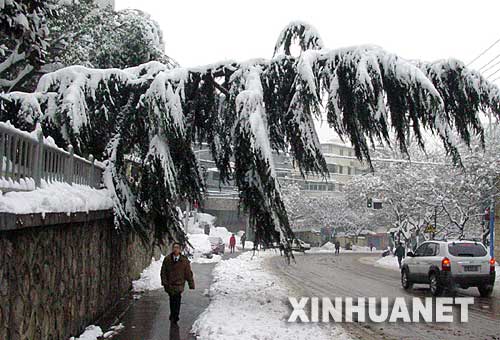 1月29日,一名行人從南京市拉薩路一棵被積雪壓倒的松樹旁經過。連日強降雪給南京的樹木造成影響,不少樹枝被積雪壓折。南京市正組織人力打雪,給樹木減負。