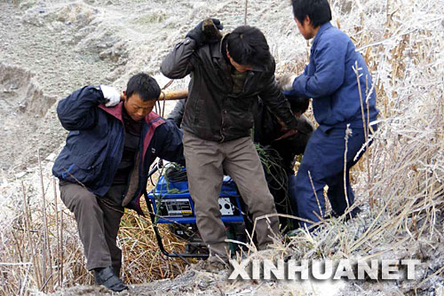 | 1月27日,在遭受冰災而停電的貴州省黔南布依族苗族自治州龍里縣災區,搶險人員正在為機站運送發電機。