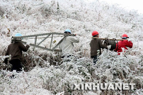 | 1月22日,凱里市供電部門職工趕往事故現場搶修供電設施。受大面積冰凍災害天氣影響,貴州電網多處線路受損,黔東南苗族侗族自治州和銅仁地區有9個縣停止供電。凱里電網2000多名職工投入“抗冰保電”一線晝夜搶修。