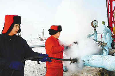 春節期間,奮戰在新疆準噶爾盆地各個油田區塊上的克拉瑪依油田石油工人,冒著零下20攝氏度的嚴寒,堅守在生產崗位上。圖為2月11日,石油工人在井區用蒸氣為油井解凍。