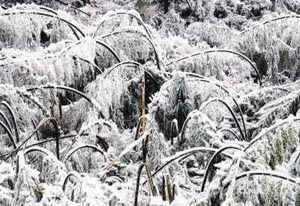 核心提示 雨雪冰凍災害肆虐南國大地。1月下旬以來,雪凝導致貴州銅仁地區萬山特區斷水斷電,交通癱瘓,通訊隔絕;在福建,50年不遇的嚴重冰凍災害襲擊武夷山區,沿線8縣遭創,林業受災最重。據不完全統計,福建林業直接經濟損失目前已超過50億元。